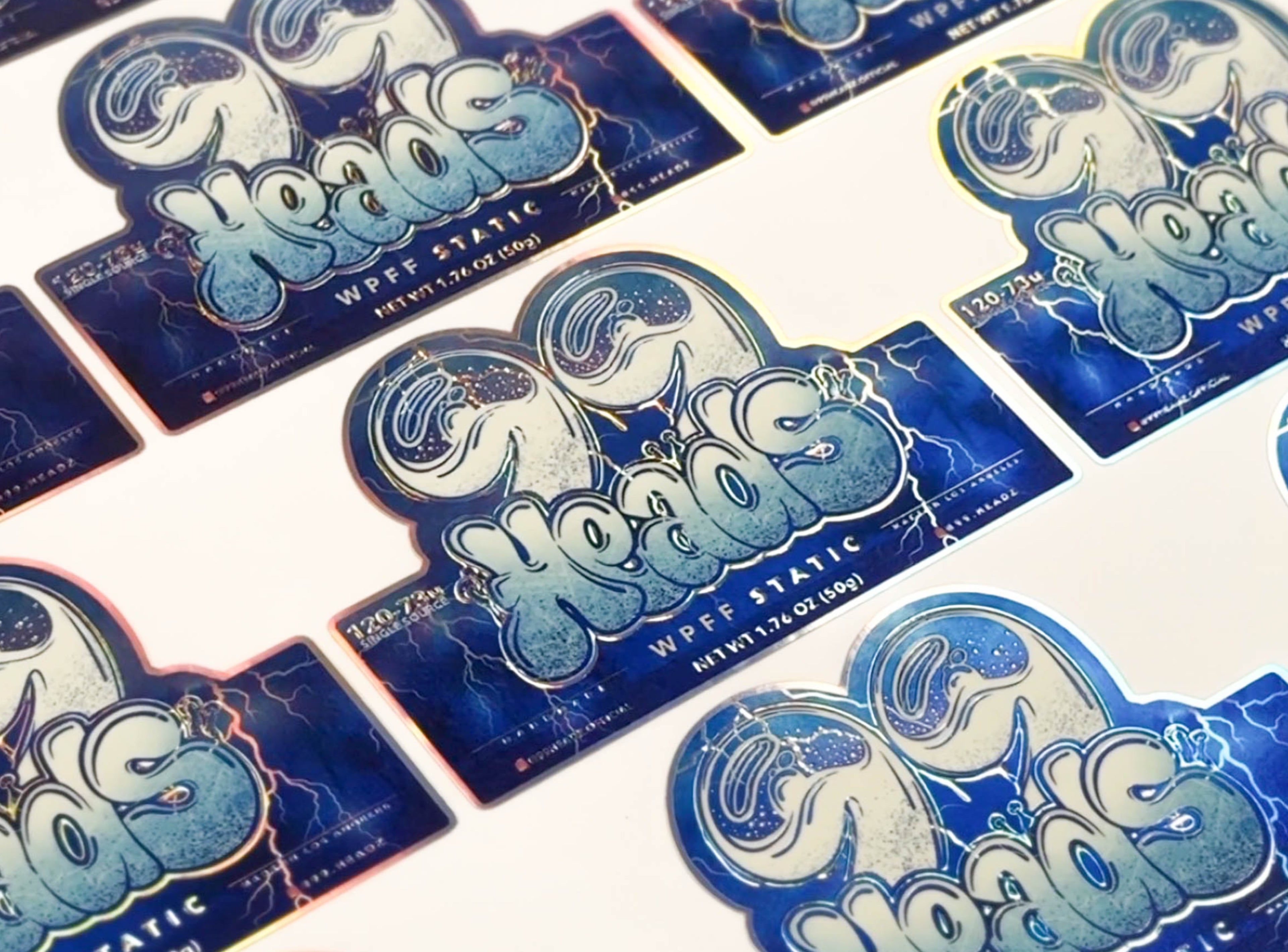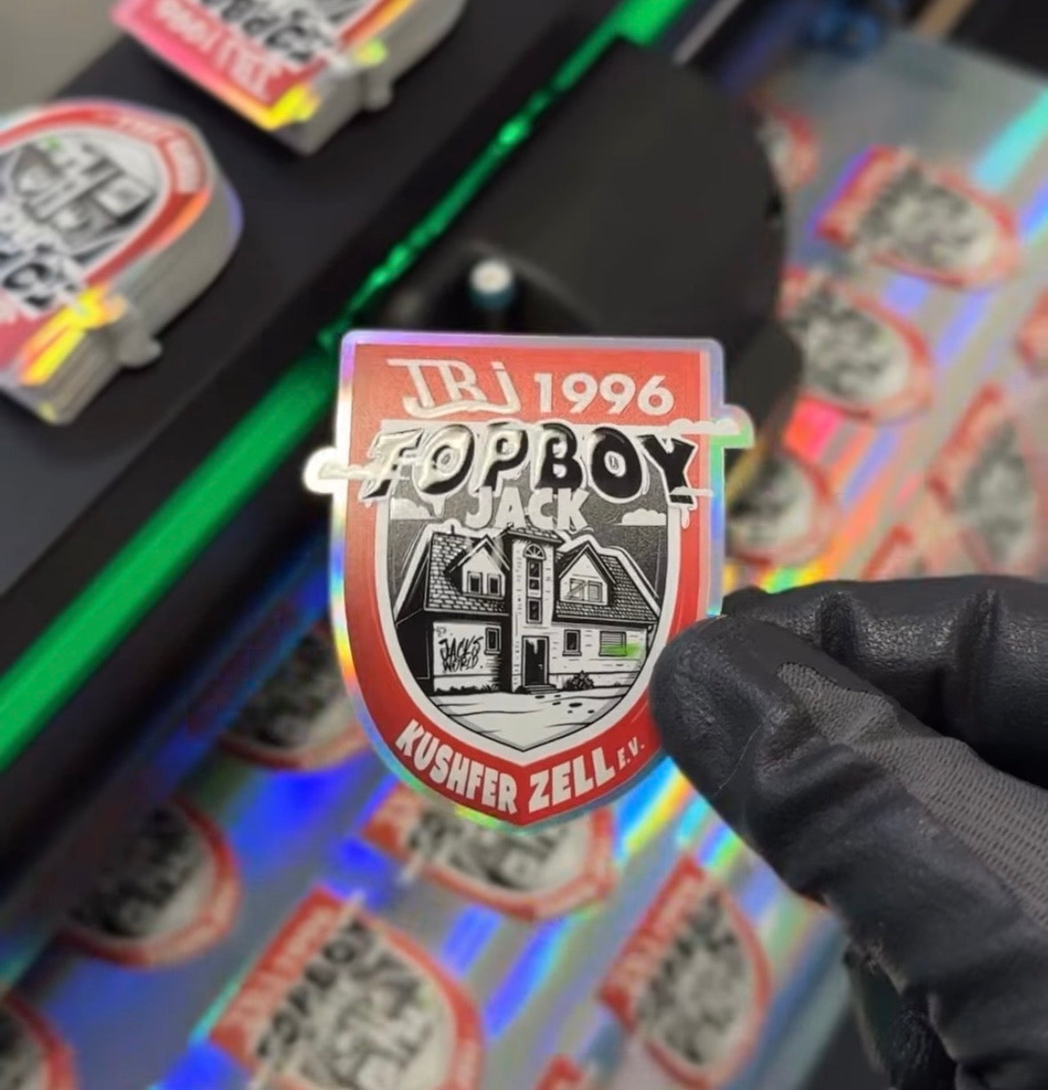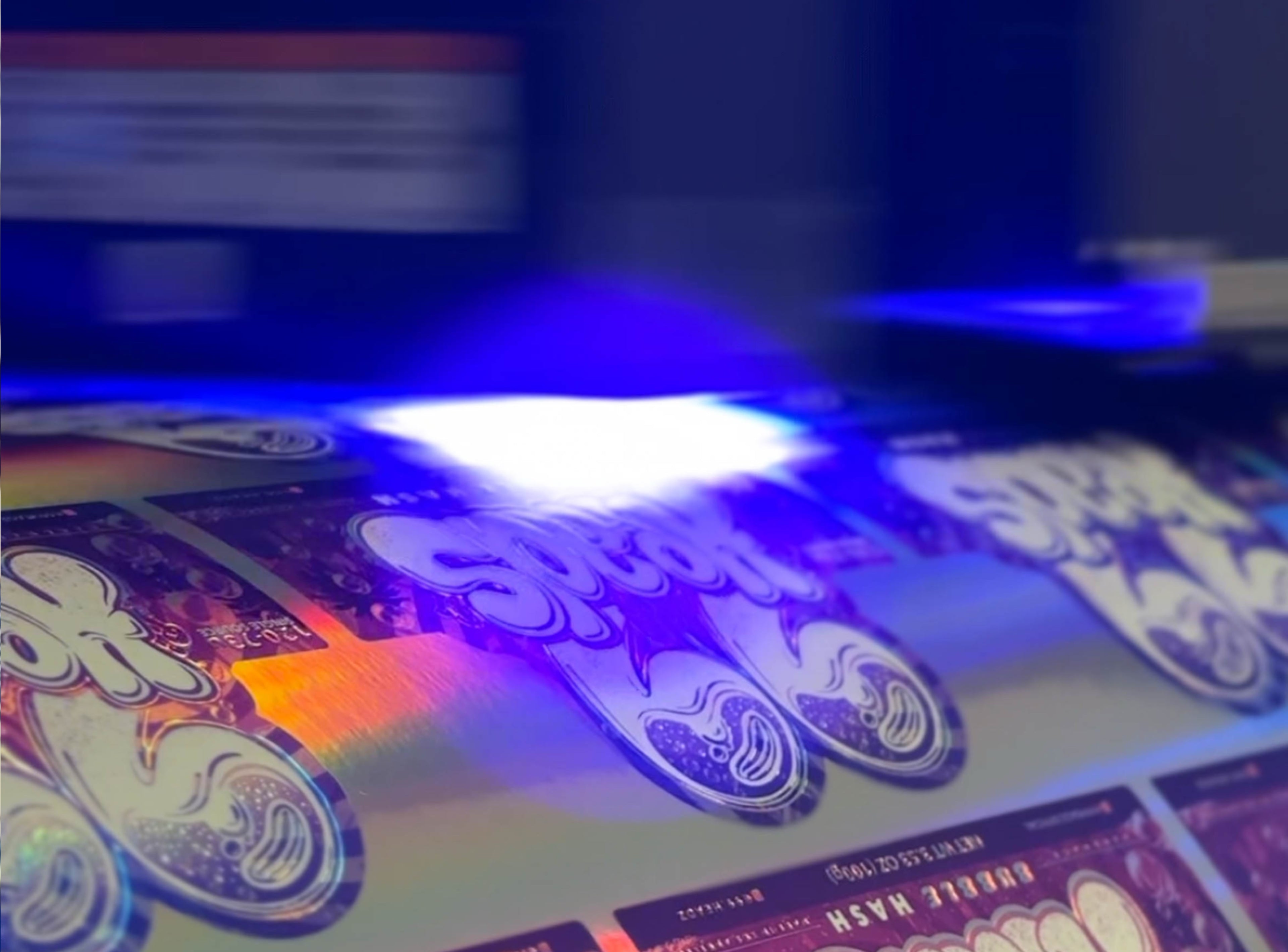 The approved design moves into production: labels are printed, checked and prepared for application.
